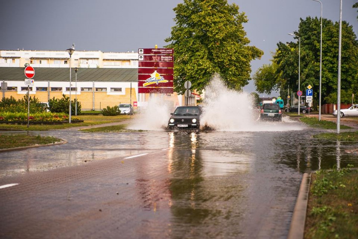 Otrdienas spēcīgās lietusgāzes Ventspils ielas vietām pārvērta nelielos ezeros, kuros prātīgi pārvietoties nācās ne vien gājējiem, bet arī automašīnām.