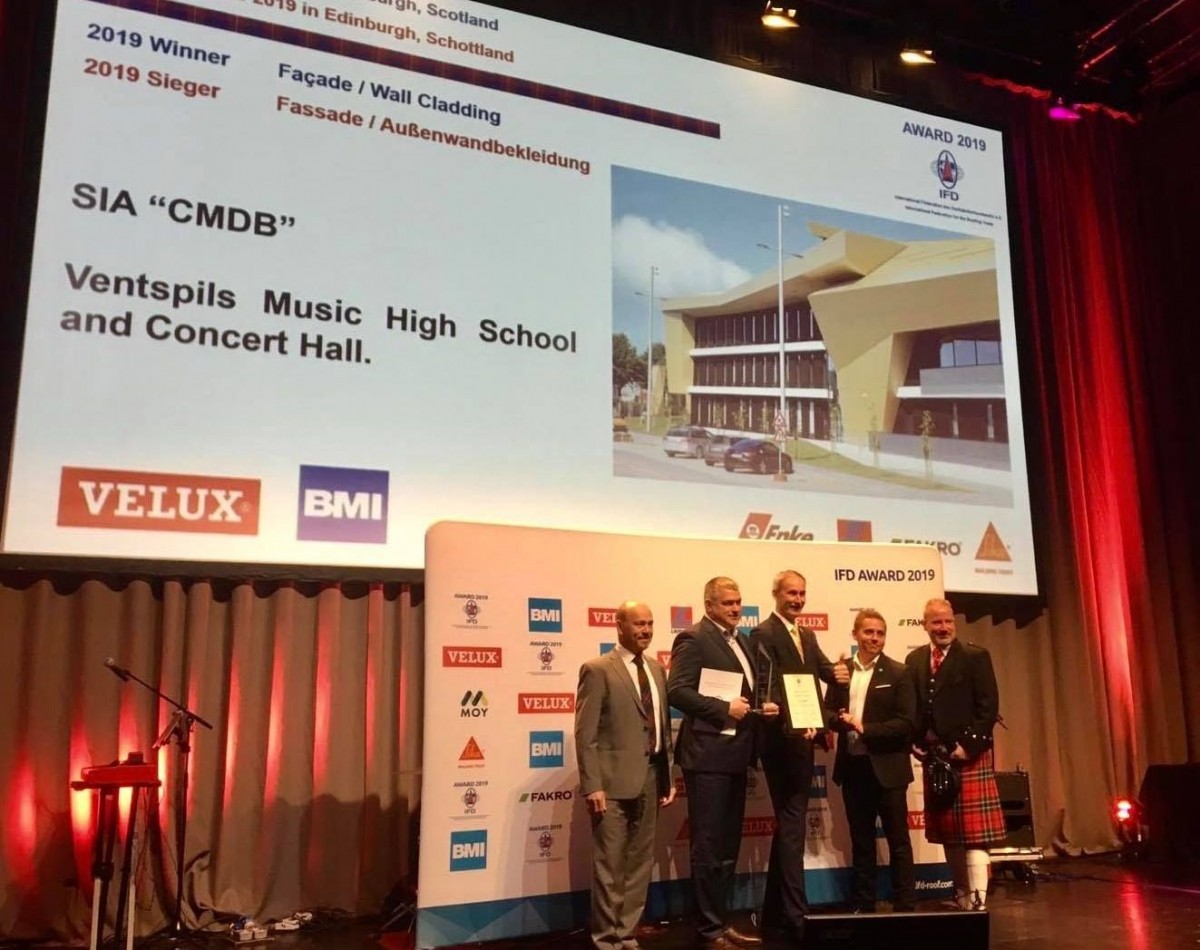 Starptautiskās jumiķu Federācijas rīkotais konkurss norisinājās septembrī IFD 2019 kongresā Lielbritānijā, Edinburgā. Konkursa ietvaros no visas pasaules tika izmeklēti skaisti, inovatīvi un sarežģīti izbūvēti jumti, kā arī vēdināmās fasādes, un to vērtēšana sadalīta četrās kategorijās - metāla jumti (1. vieta Amerikas Savienotās Valstīs realizēts objekts), plakanie jumti (1. vieta Austrijā un Latvijā realizēts objekts), slīpie jumti (1. vieta Ķīnā realizēts objekts), fasādes-ventilējamās (1. vieta Ventspils pilsētā realizētā Koncertzāle “Latvija” un Ventspils Mūzikas vidusskola).
