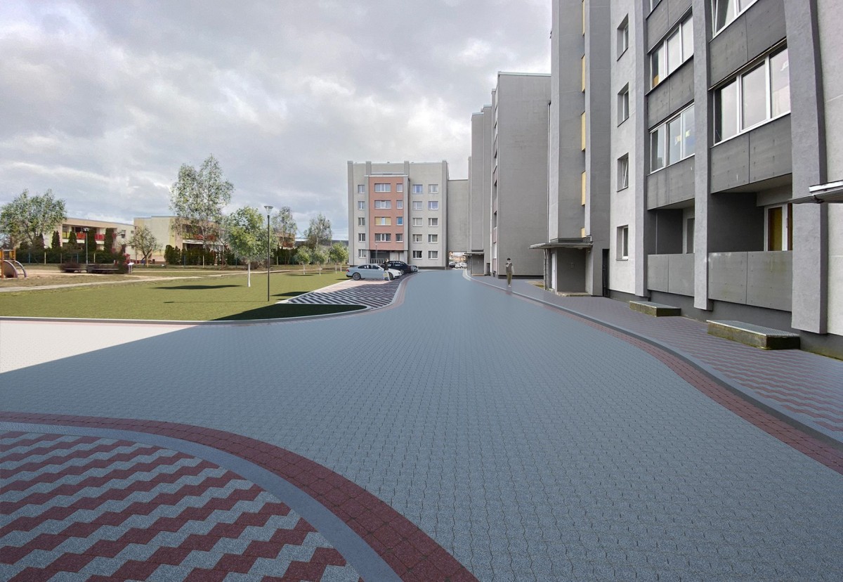 Minētajā iekšpagalmā tiks veikta 609 m2 brauktuves un 14 autostāvvietu izbūve betona bruģakmens segumā, lietusūdens savākšanas notekas izbūve, gājēju zonas izbūve uz mājas ieejas mezgliem, kā arī jauna energoefektīva LED apgaismojuma izbūve.