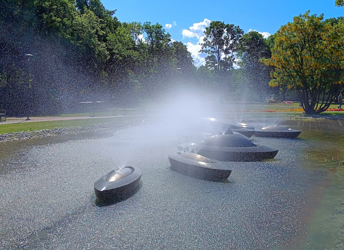 Strūklaka “Saules laiviņas” atrodas pilsētas centrā, un tās baseina platība ir 250 m². Tā veidota kā simboliska jūra ar lēcas formas baseinu, kura centrā izvietoti septiņi tēlniecības objekti – slīpēta akmens laivas. Nerūsošā tērauda elementi jeb “laivu muguriņas” simbolizē sauli, un tajos integrētās sprauslas izsmidzina ūdeni smalkas miglas veidā. Saulainā laikā apmeklētāji var vērot arī varavīksnes efektu, kas veidojas ūdens pilienos.