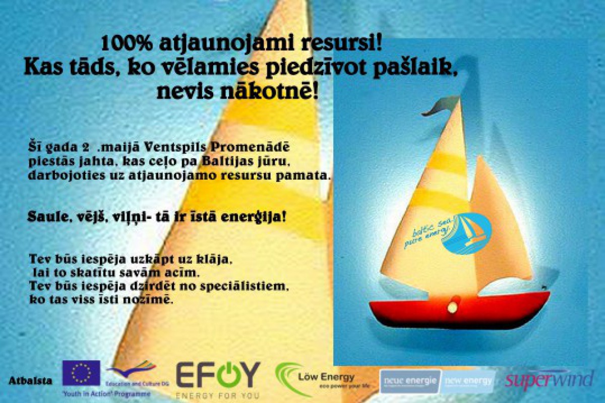 Ventspilī kuģītis piestās 21.maijā Ostas ielas promenādē. Apmeklētāji tiek aicināti visas dienas garumā uzkāpt uz klāja un pārliecināties, ka alternatīvā enerģija nav utopija, bet kas tāds, ko jebkurš no mums var realizēt, ja apzināmies, ka vide ir mūsu atbildība.