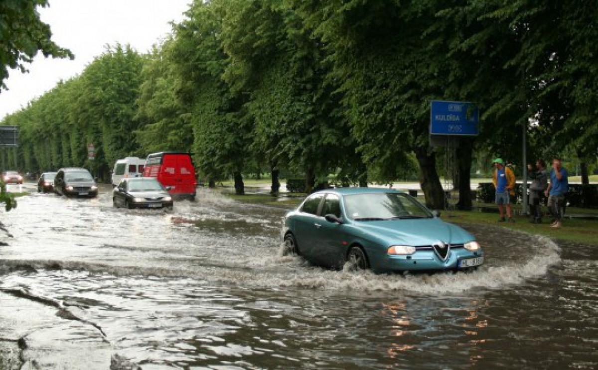 Stiprā lietus dēļ ceturtdien uz brīdi Ventspils ielas pārvērtās par upēm.